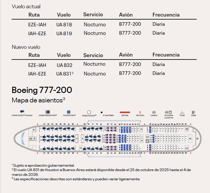 • Actualmente, United opera un vuelo diario, nocturno y sin escalas desde Buenos Aires hacia Houston, a bordo de un Boeing 777-200 y sumó una frecuencia diaria extra en verano, del 26 de octubre del 2025 al 06 de marzo 2026.